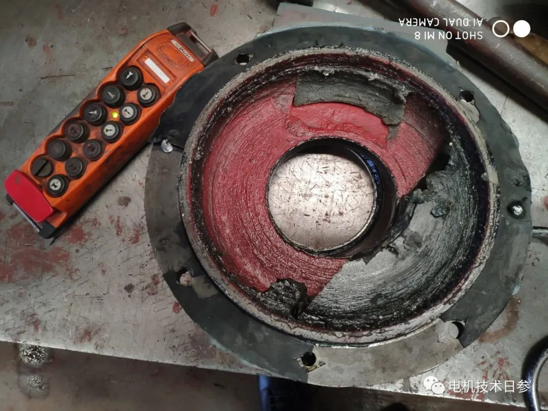 在這類故障電機(jī)的解剖過(guò)程中可以發(fā)現(xiàn)至少有以下一種表象:軸承或缺油的干磨狀態(tài);潤(rùn)滑脂發(fā)生變黑、結(jié)塊;軸承已發(fā)生明顯的機(jī)械性或電腐蝕損傷。